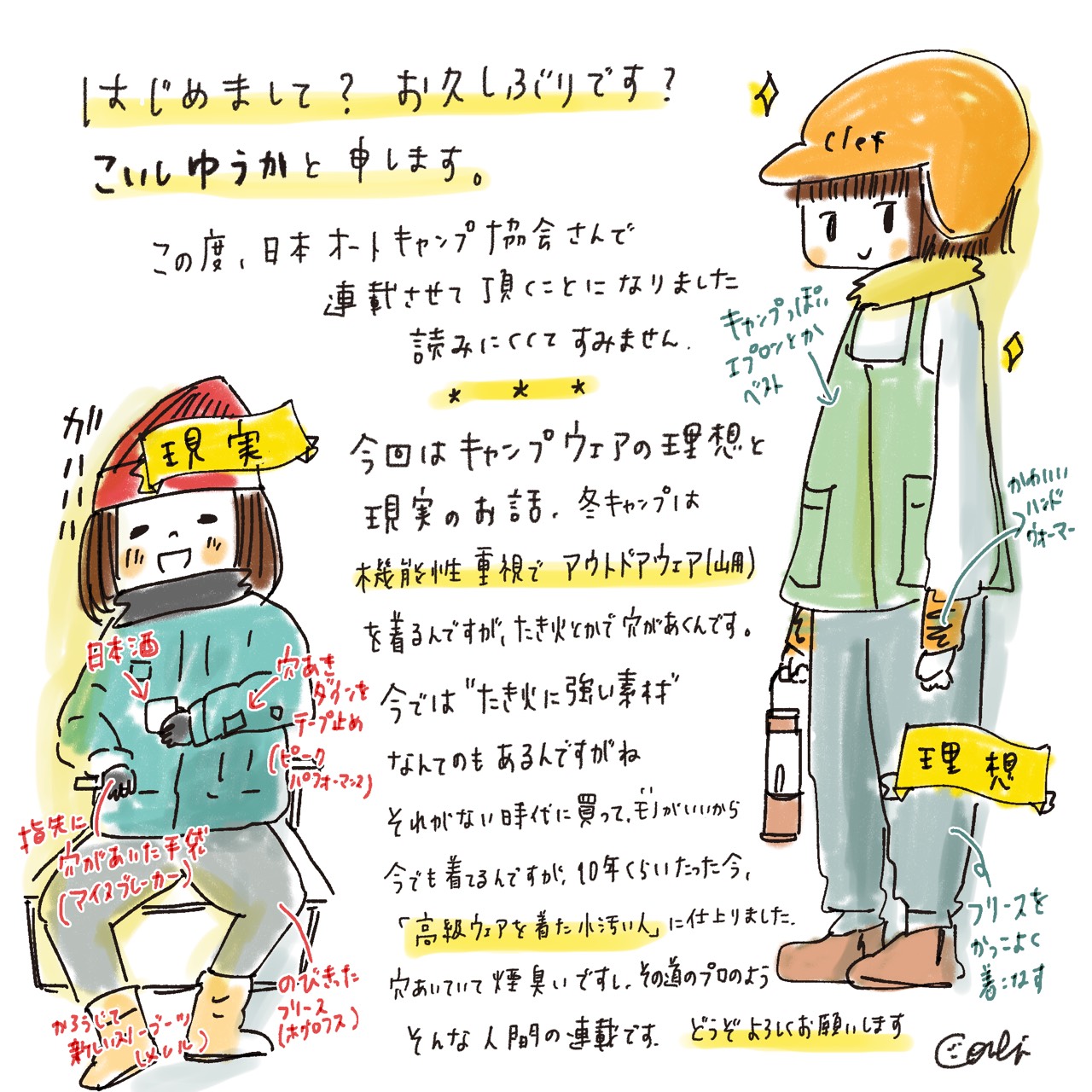 キャンプコーディネイター、漫画家のこいしゆうかと申します。連載はじまりました。のんびりと自由にキャンプに関すること描かせていただきたいと思っています!