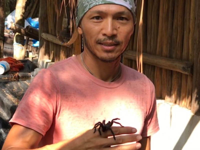 サソリやタランチュラは日常だ。ある日、村人に「タランチュラはおとなしいよ」と言われ、私は試しに腕へ乗せてみた。ふさふさした脚から伝わる柔らかな感触は意外にも友好的で、タランチュラ=怖い、危ないという先入観が見事に覆された瞬間だった。