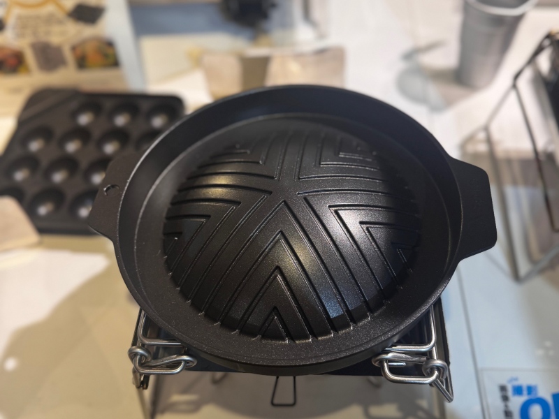 「カコム グリルプレート」。炭火を使わずシングルバーナーで焼き肉料理が楽しめるアイテム。なんと本体に水を張ることで煙の軽減や油落ちでの汚れ・引火も抑制。これかなり便利そう。