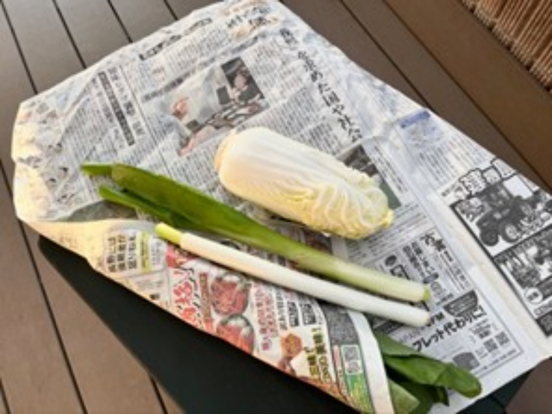この新聞紙の活用方法は登山者ならご存知かと思います。なす、きゅうり、ねぎなどを一本ずつ包んでザックに入れていきます。葉物はサッと洗って軽く水を切ったらそのまま包みます。夏場でもこれだけで驚くほど鮮度がキープできますよ。新聞紙の保湿や吸水効果を活用するのです。